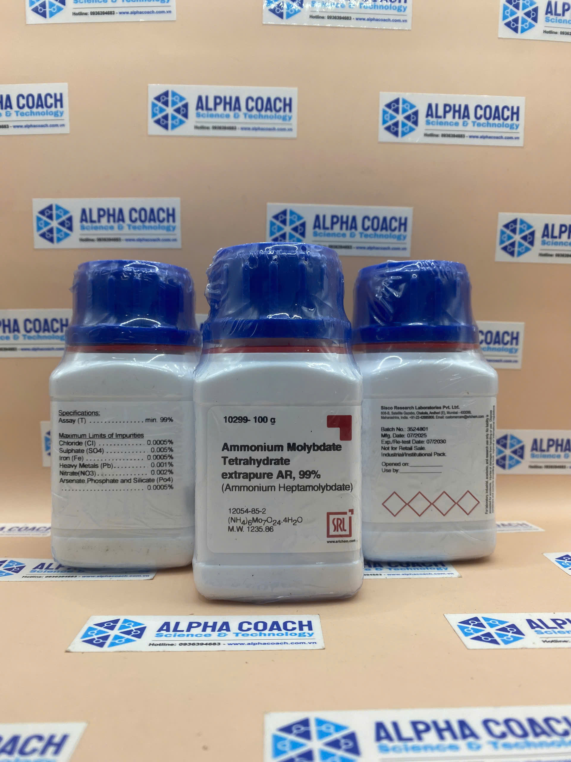 Hoá chất Ammonium Molybdate Tetrahydrate extrapure AR, 99%, lọ 100g, hãng SRL, Ấn Độ